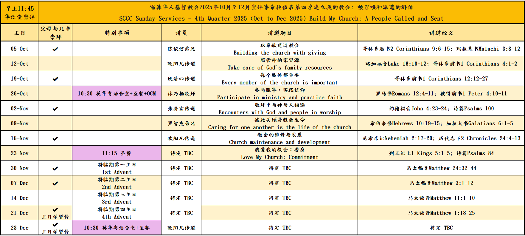 圣餐主日(每月第四周): 上午 11:15 – 11:30